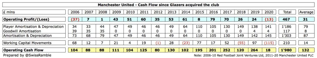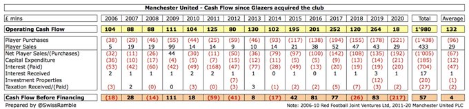 Nos últimos 15 anos o United gerou uma receita impressionante de £5,9 bilhões, mas tiveram £5,4 bilhões de despesas (incluindo £ 2,9 bilhões de salários e £ 1 bilhão de amortização de jogadores), levando a £467 milhões de lucro operacional. Isso foi impulsionado por um lucro de £257 milhões nas vendas de jogadores, mas £817 milhões de juros significaram uma perda de £92 milhões.