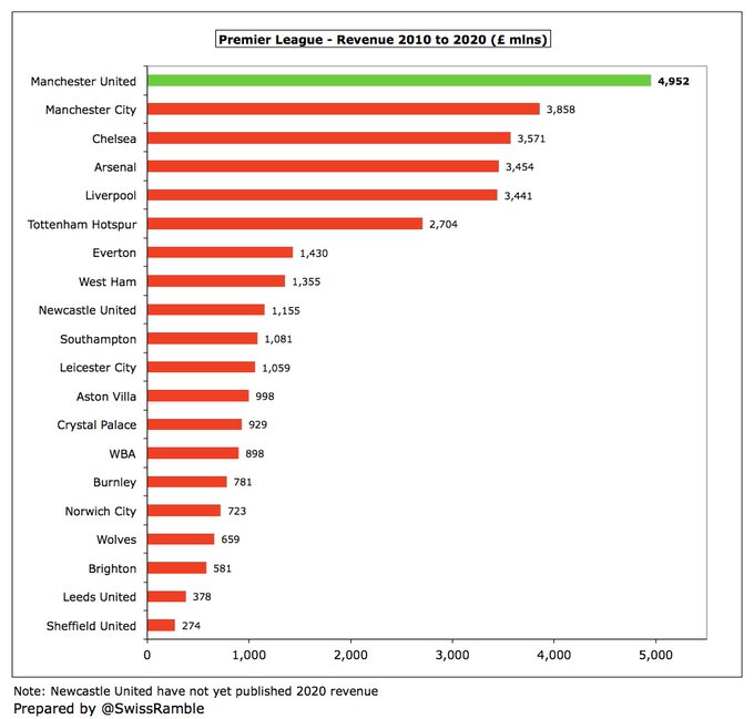 Certamente é verdade que a receita do United quase triplicou com os Glazers, aumentando £ 336 milhões de £ 173 milhões para £ 509 milhões, mas é importante notar que dois clubes os ultrapassaram neste período, nomeadamente City e Liverpool, que cresceram £ 417 milhões e £ 370 milhões, respectivamente.