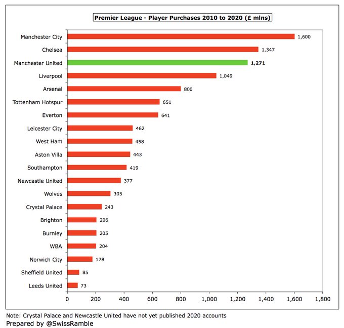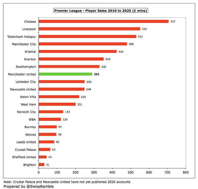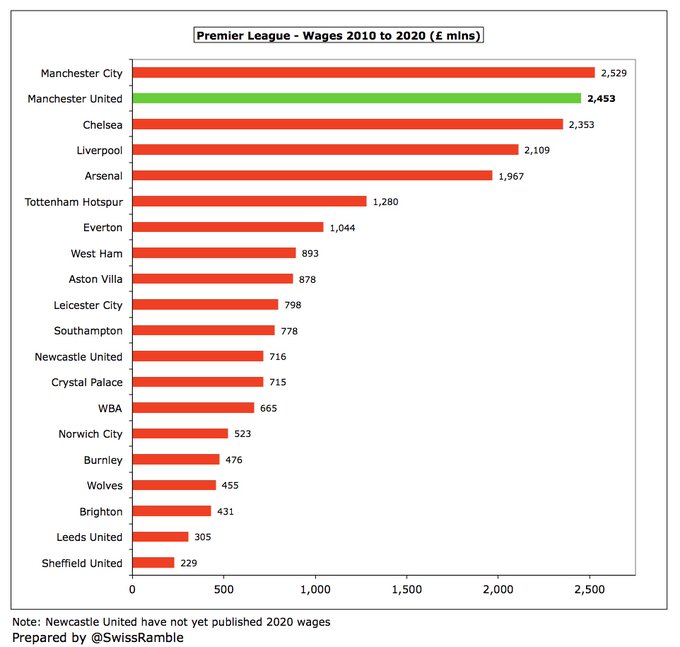 A receita de transmissão triplicou de £ 46 milhões para £ 140 milhões, mas o crescimento de £ 94 milhões é menor do que £166 mi do City, £152 mi do Liverpool, £130 mi do Chelsea e £107 mi do Tottenham, o que reflete a falta de sucesso em campo, principalmente nas competições europeias. Todos os clubes foram fortemente impactados pela COVID em 2020.