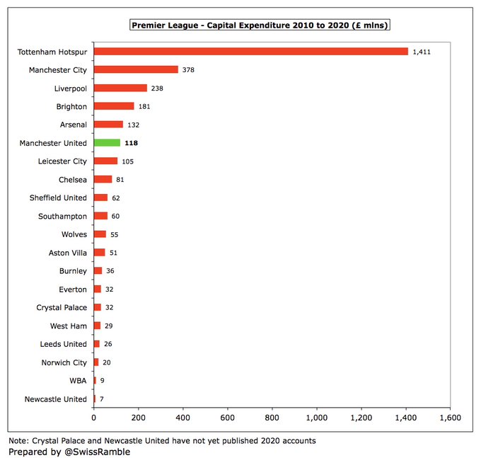 Da mesma forma, o aumento de £ 18 milhões na receita do dia do jogo do United que foi de £ 72 milhões a £ 90 milhões é menor do que o crescimento de quatro outros membros do Big Six, já que outros investiram em mudanças ou expansão de estádios: £ 77mi no Tottenham, £ 38mi Liverpool, £ 35mi no Arsenal e £ 26mi no City. Na verdade, o Spurs ultrapassou o United em 2020.
