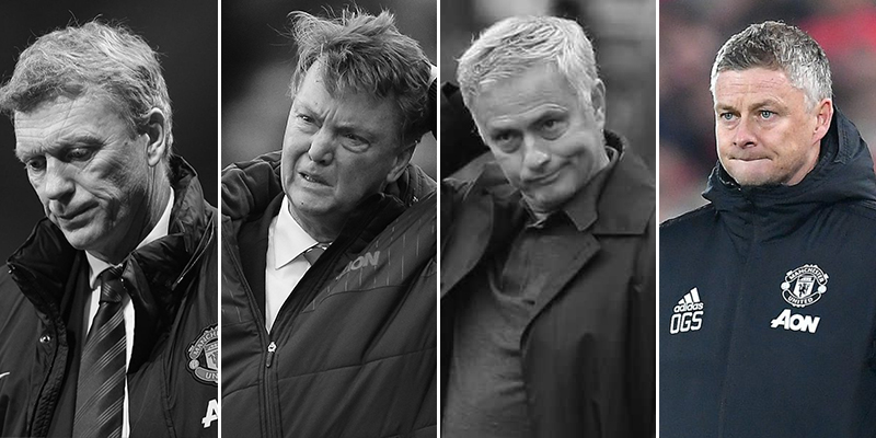 Três técnicos foram contratados para criarem uma nova era: David Moyes, Louis van Gaal e José Mourinho, todos foram campeões com o clube. David Moyes conquistou a Community Shield de 2013; van Gaal conquistou a FA Cup na temporada 2015/2016 e José Mourinho com os títulos da Community Shield em 2016, Copa da Liga e Europa League na temporada 2016/2017 foi o que mais obteve o melhor desempenho em campo. Contudo, todos fracassaram na conquista da Premier League, que havia virado comum na sala de troféus do clube. Desde que o campeonato inglês foi renomeado e passou por reformulações na temporada 1992/1993 até a última temporada do Sir Alex Ferguson no comando do clube em 2012/2013, o United nunca tinha ficado mais de 3 temporadas sem conquistar o título, sem contar que sua pior colocação era o terceiro lugar.