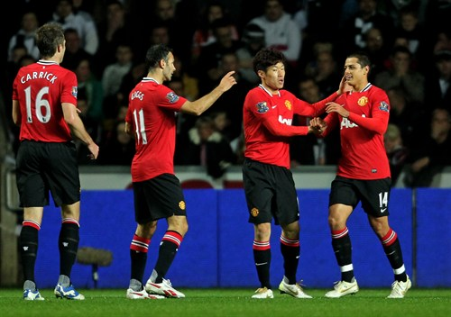 Começo de jogo e o time do Swansea começou a pressionar o United marcando bem e tocando muito bem a bola, porém a pressão durou apenas cincos minutos, quando o United começou a manter a posse de bola e analisar mais o adversário, até que aos 10 minutos o Angel Rangel tentou sair tocando e tocou para o Giggs que invadiu a área e tocou para o Chicharito, que mandou a bola para o fundo das redes, fazendo seu 4º gol na Premier League.