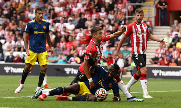 Depois de estrear a nova temporada da Premier League com uma goleada convincente no derby contra o Leeds United, os Red Devils visitaram neste domingo (22) a equipe do Southampton, no St. Mary Stadium, pela 2ª rodada da competição. Os dois times tiveram boas chegadas com a bola parada no começo do confronto. Com um minuto de jogo, Ward-Prowse cobra boa falta para a defesa de De Gea, que vai buscar no quanto. Logo depois, Bruno Fernandes cobra falta, Lindelof fura cabeçada, Maguire desvia mandando para o alto, em seguida acertando o travessão, no rebote Martial cabeceia pro gol e a defesa tira a bola na linha.