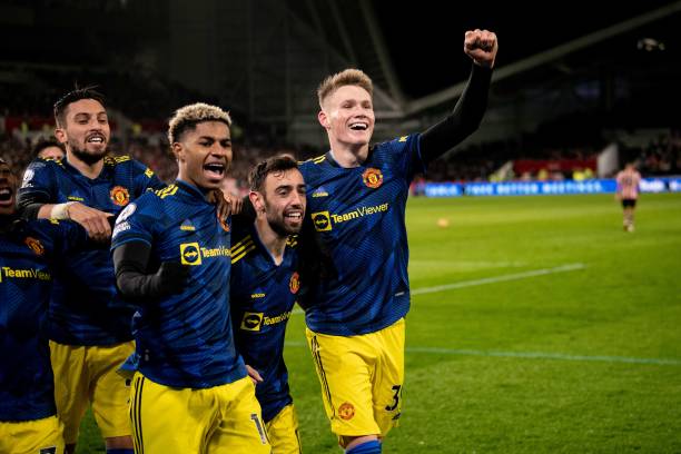 Em mais uma jogada que começou dos pés de McTominay, United amplia e faz seu terceiro gol no minuto 77. Scott intercepta passe no meio-campo, dribla dois jogadores adversários e deixa com Bruno Fernandes que abre com Rashford na esquerda. Marcus entra na área e bate de primeira. A bola acerta o ângulo do gol, sem chances para Lössl fazer a defesa. Aos 85 minutos, Brentford diminui. Após bola jogada dentro da área e de muito bate-rebate, Toney marca o gol de honra para o time mandante.
