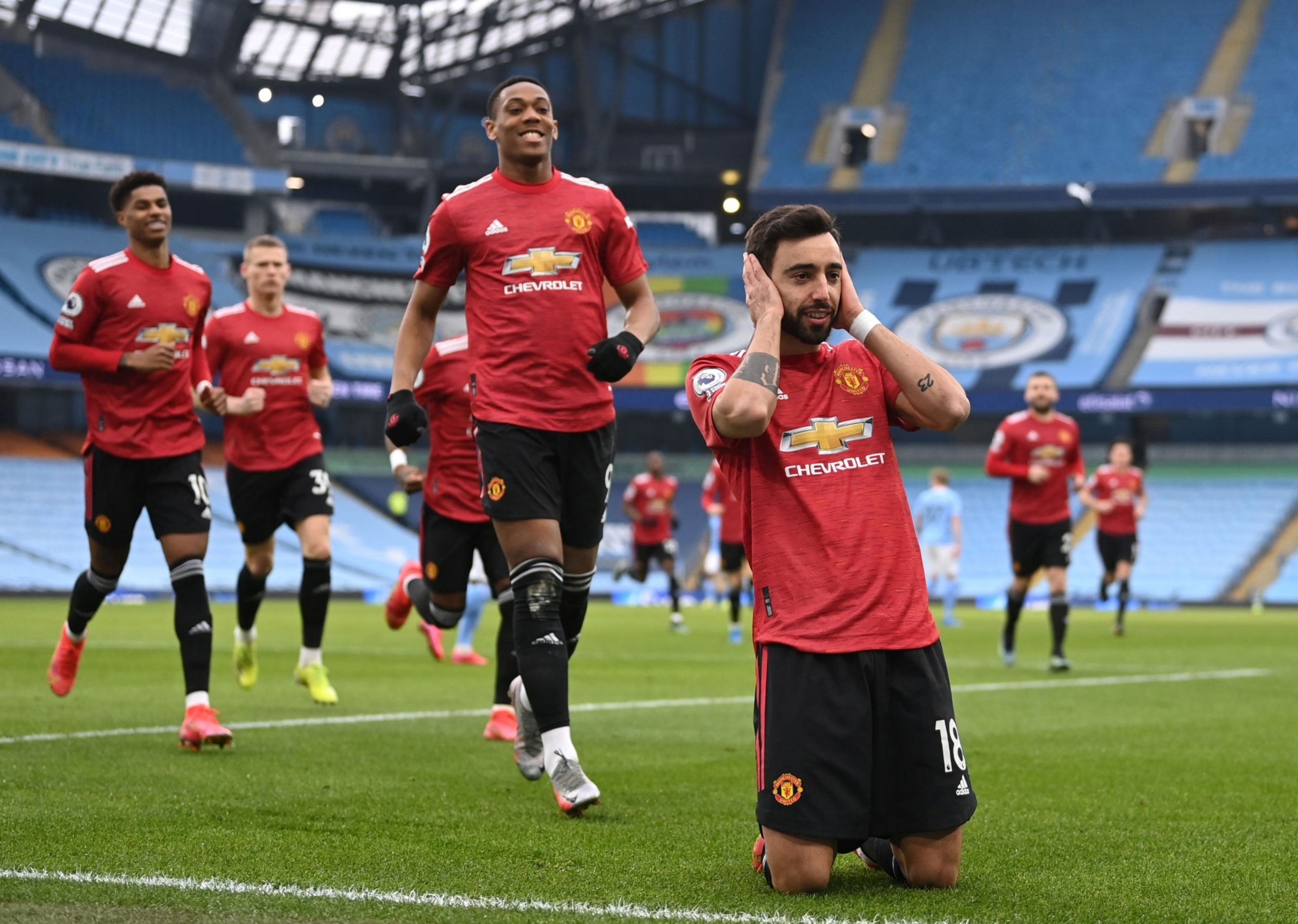 Tendo empatado nas duas últimas rodadas na Premier League, os red devils tinham pela frente seu rival Manchester City, que há muito tempo não sabia o que era perder. Dentro de casa, no Etihad Satdium, a equipe azul de Manchester e líder isolado do campeonato buscava sua 22ª vitória seguida somando todas as competições que disputa, em contrapartida, o United precisava vencer para voltar a segunda colocação. A partida mal havia começado quando Martial é derrubado por Gabriel Jesus dentro da grande área, imediatamente o árbitro marca a penalidade e, como sempre, Bruno Fernandes é quem pega a bola para cobra-la. Ederson ainda consegue encostar na bola, mas não é o suficiente para impedir o gol do português.