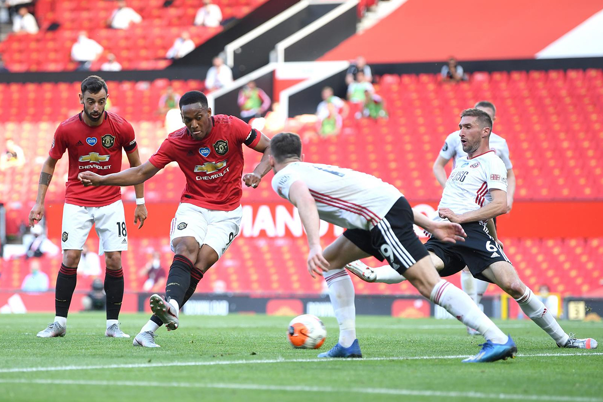 Após o empate com o Tottenham, o Manchester United recebeu o Sheffield United, no Old Trafford, adversário direto na disputa por uma vaga na zona de classificação para próxima Champions League. A partida começou bem movimentada, com os red devils com mais posse de bola e muito presente no campo adversário. A boa postura do United foi traduzida na abeertura do placar aos 6 minutos, quando após arremeso lateral próximo a área, Martial deixou para o Rashford, o camisa 10 foi até a linha de fundo e cruzou rasteiro, Martial se antecipou a marcação e mandou para o fundo das redes.