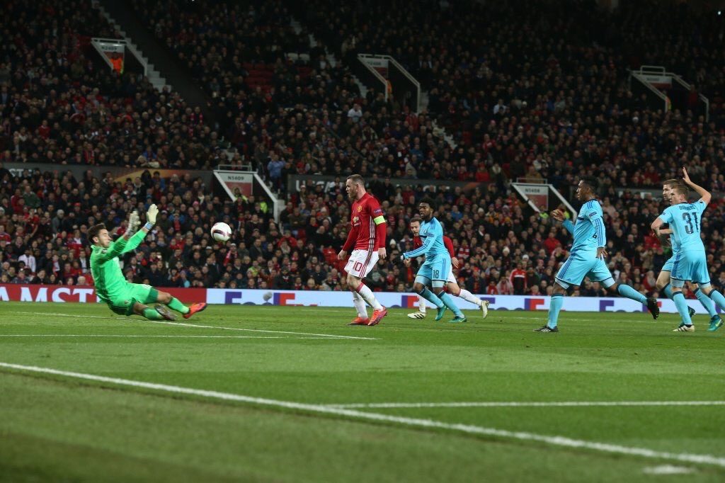 Na reta final do primeiro tempo, o United pressionou e foi premiado. Após bela enfiada de bola de Zlatan Ibrahimovic, Wayne Rooney saiu frente a frente com Jones e com um toque do craque que é, apenas cavou e colocou os Red Devils a frente do placar. Com esse gol, o capitão se tornou o maior artilheiro do United em competições europeias com 39 gols.