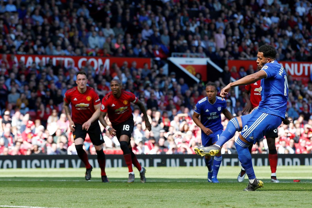 Apesar de ter menos posse de bola, o Cardiff conseguia chegar ao ataque com velocidade e levando algum perigo ao De Gea e mesmo com domínio do United, foram os visitantes que abriram o placar aos 22 minutos. Dalot estava disputando a bola com Mendez-Laing dentro da área, quando o português deu carrinho tentando tirar a bola do adversário, que por vez tentou chutar, errou e caiu, o árbitro marcou pênalti e o próprio Mendez-Laing converteu a cobrança.
