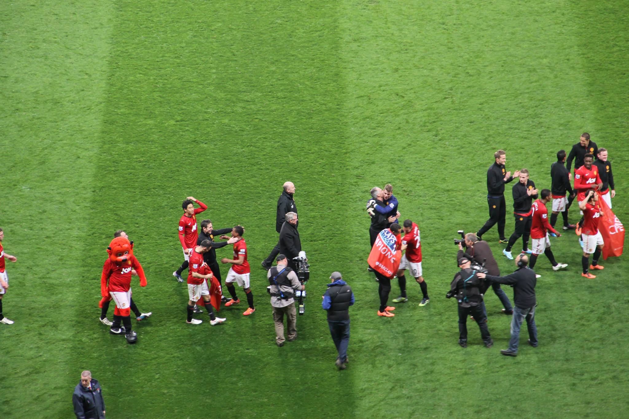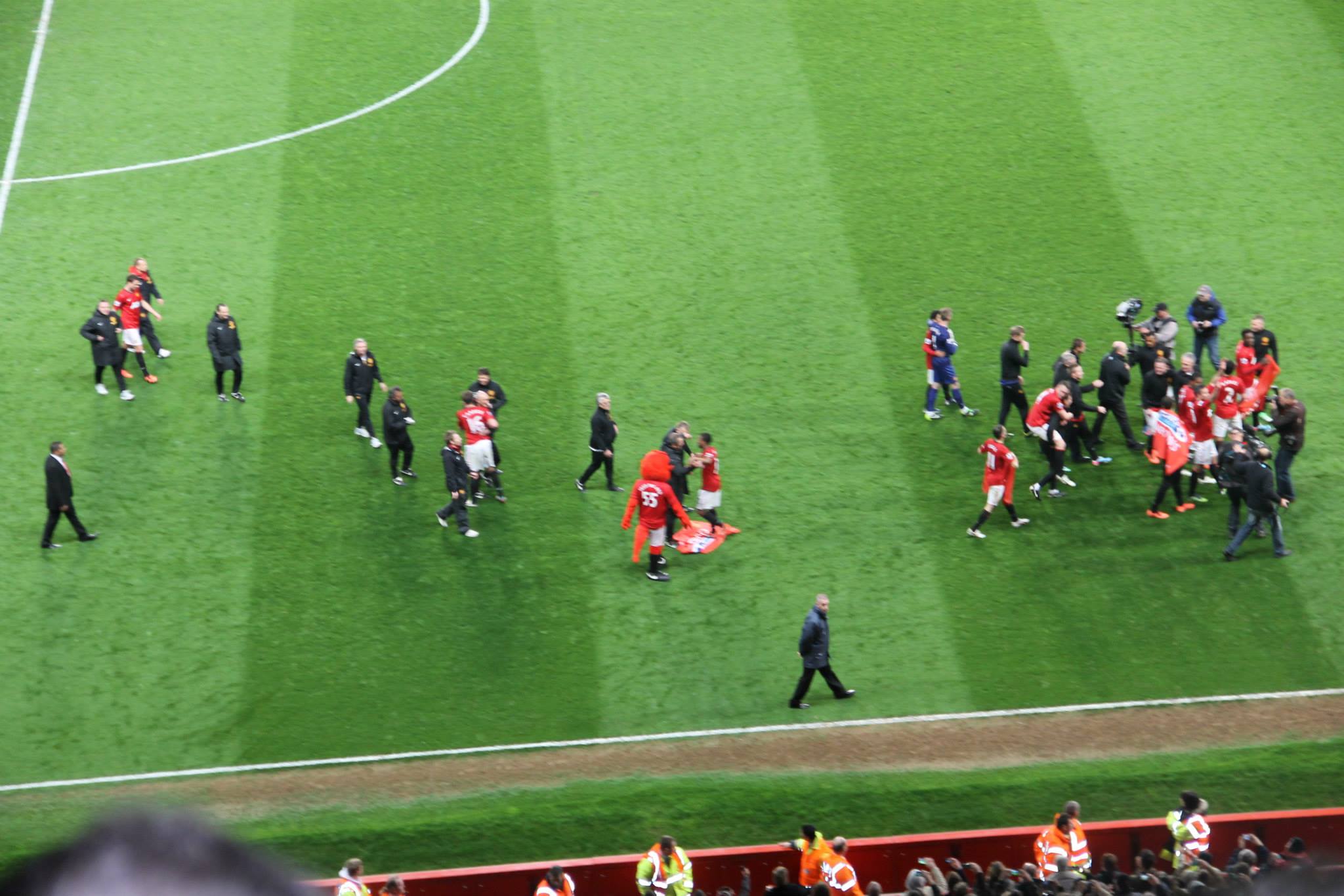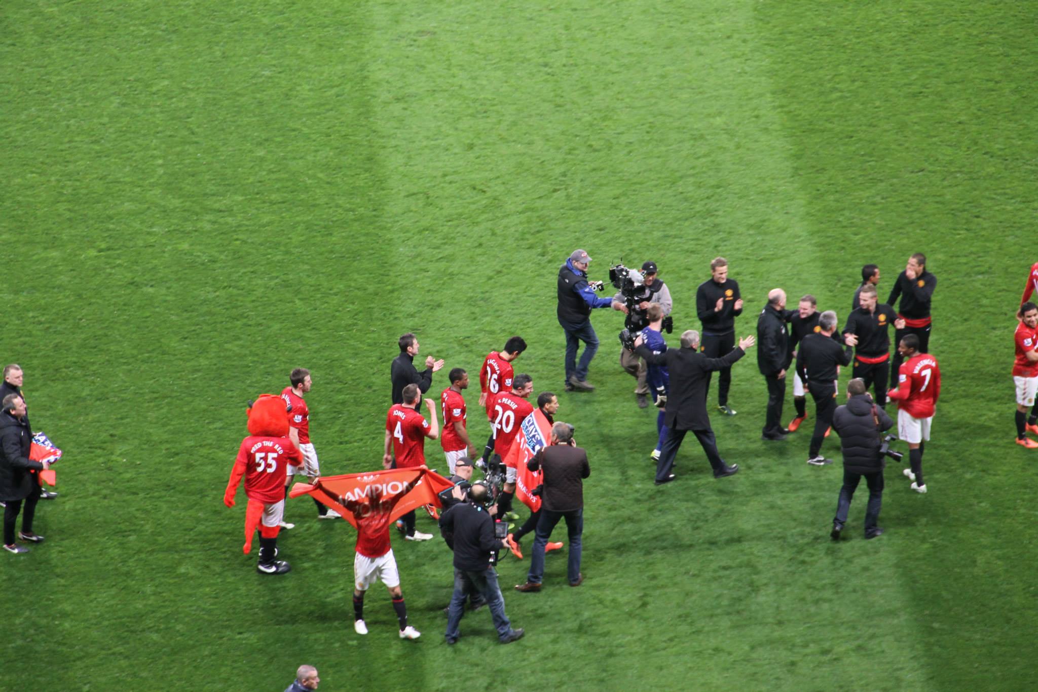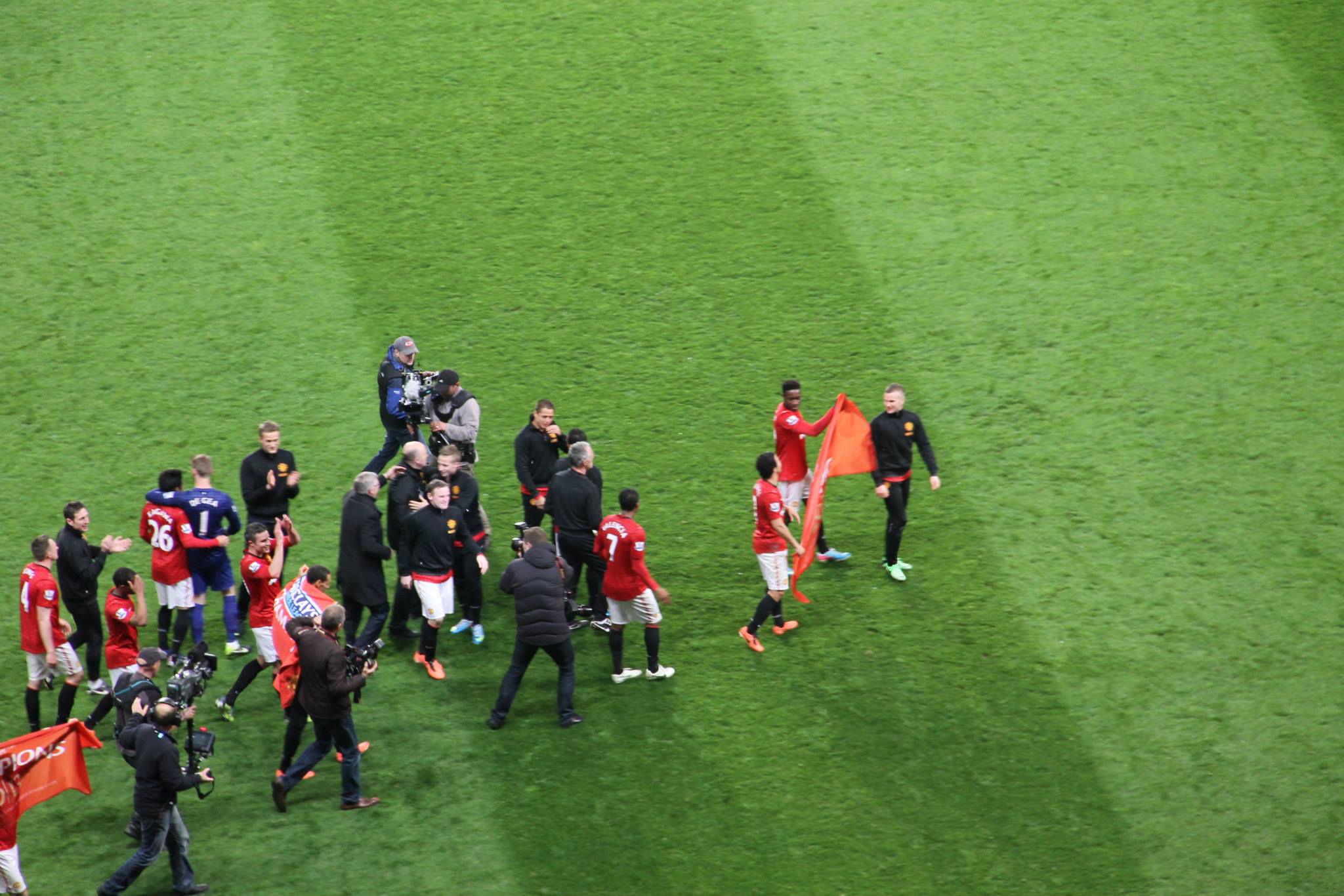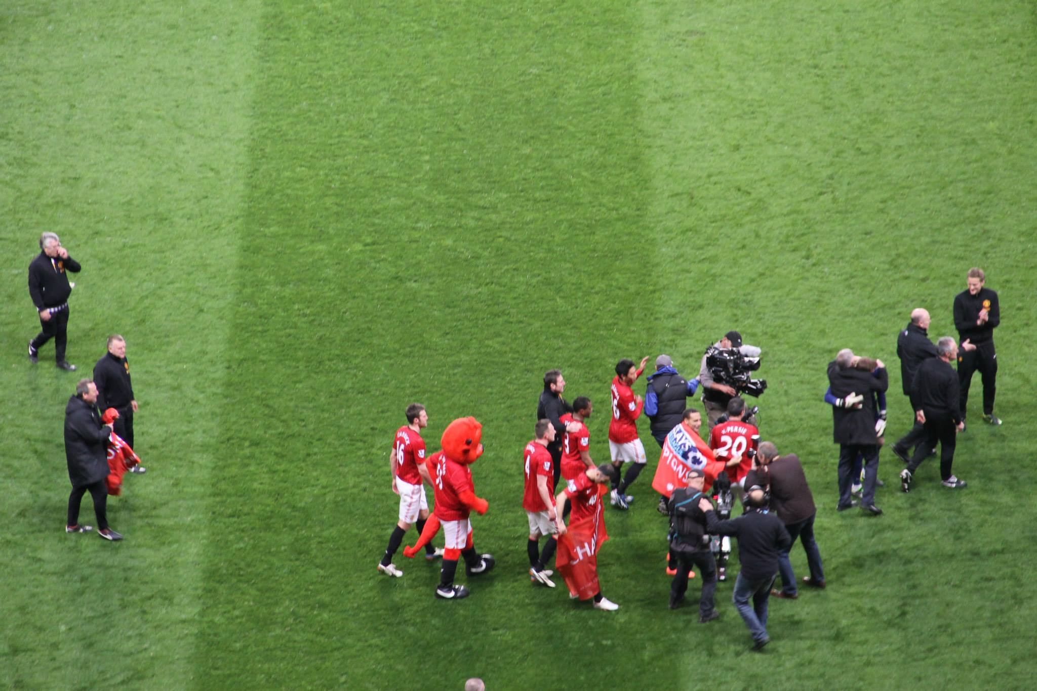 Eu tinha um pensamento que a torcida do United só fazia barulho na casa do adversário, me enganei porque a torcida canta o tempo inteiro, principalmente as que estão atrás de cada um dos gols, vibram, batem palma, gritam por qualquer jogada. Antes do jogo não houve engarrafamento, muito policiamento, as pessoas iam chegando por toda parte, mas todas calmas, não houve confusão em momento algum, as pessoas todas muito educadas e os funcionários do estádio bastante atenciosos e simpáticos. No fim da partida era possível ouvir em todos os cantos os torcedores cantando “We are the champions”. Fora do estádio muitas pessoas tirando fotos, inclusive eu, por toda parte podia se ver os torcedores felizes da vida.